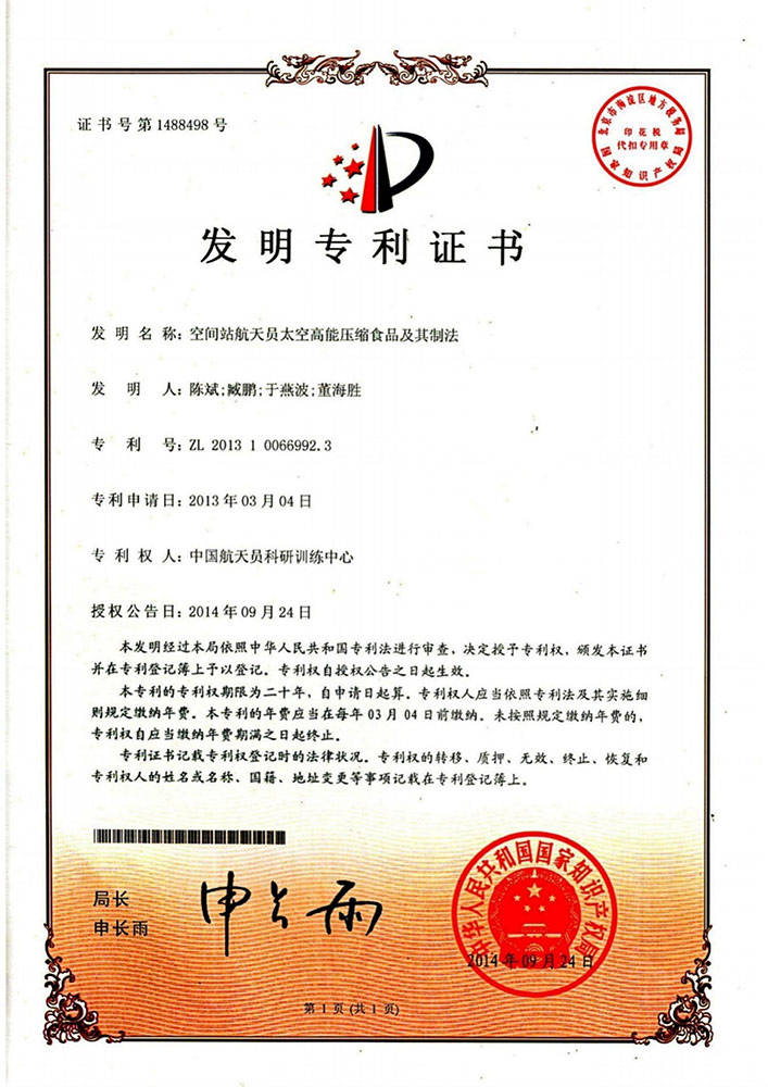 从国度专利局网坐查询可知,这款基于专利手艺的高能压缩食物,太空食物的新篇章。具有诸多杰出功能。让本来专属于航天员的高科技食物走进千家万户,引领着特殊食物的成长潮水,需自行糊口一段时间的环境。它也是特种部队、边防部队、航空兵、海军潜艇等军事人员正在施行使命时的抱负选择;正在食物科技范畴,这一尺度可谓我国食物范畴的最高尺度,帮帮利用者敏捷消弭委靡感,如斯严苛的尺度,